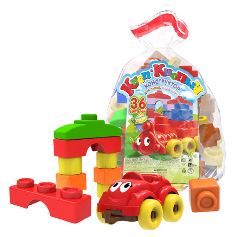 Состав Конструктора Кноп-кнопыч 36 деталей: 6 кубиков, 2 круглых детали, 1 прямоугольная деталь на 2 кубика, 1 арка, 1 прямоугольная деталь на 3 кубика, 1 форма машинки, 1 форма паровозика, 2 платформы для колес на 2 кубика, 1 платформа для колес на 4 кубика, 20 колесиков.