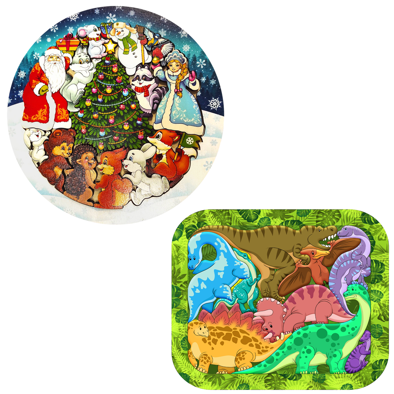 Пазлы для малышей набор Зоопазлов: Новогодняя сказка и Динозавры. Пазл для малышей зоопазл Новогодняя сказка. Погрузитесь в новогоднюю сказку с волшебными пазлами. Яркие краски, необычная иллюстрация, экологичный материал. Это интересный пазл головоломка будет способствовать логическому мышлению, мелкой моторике и воображению вашего ребенка. В набор входит 15 фигурок сказочных героев, которых надо правильно расположить на панели, чтобы пазл сошелся. С детьми маленького возраста это будет отличный дидактический материал, чтобы запомнить героев новогодних сказок. Количество деталей: 15. Материал: дерево. Страна производства: Россия. Размер пазла: 24,5х24,5 см. Зоопазл «Динозавры» 9 деталей поможет с пользой провести досуг, а также поспособствует развитию цветового восприятия, логического мышления и мелкой моторики. Размер пазла 24,5х20,5 см. Подробнее